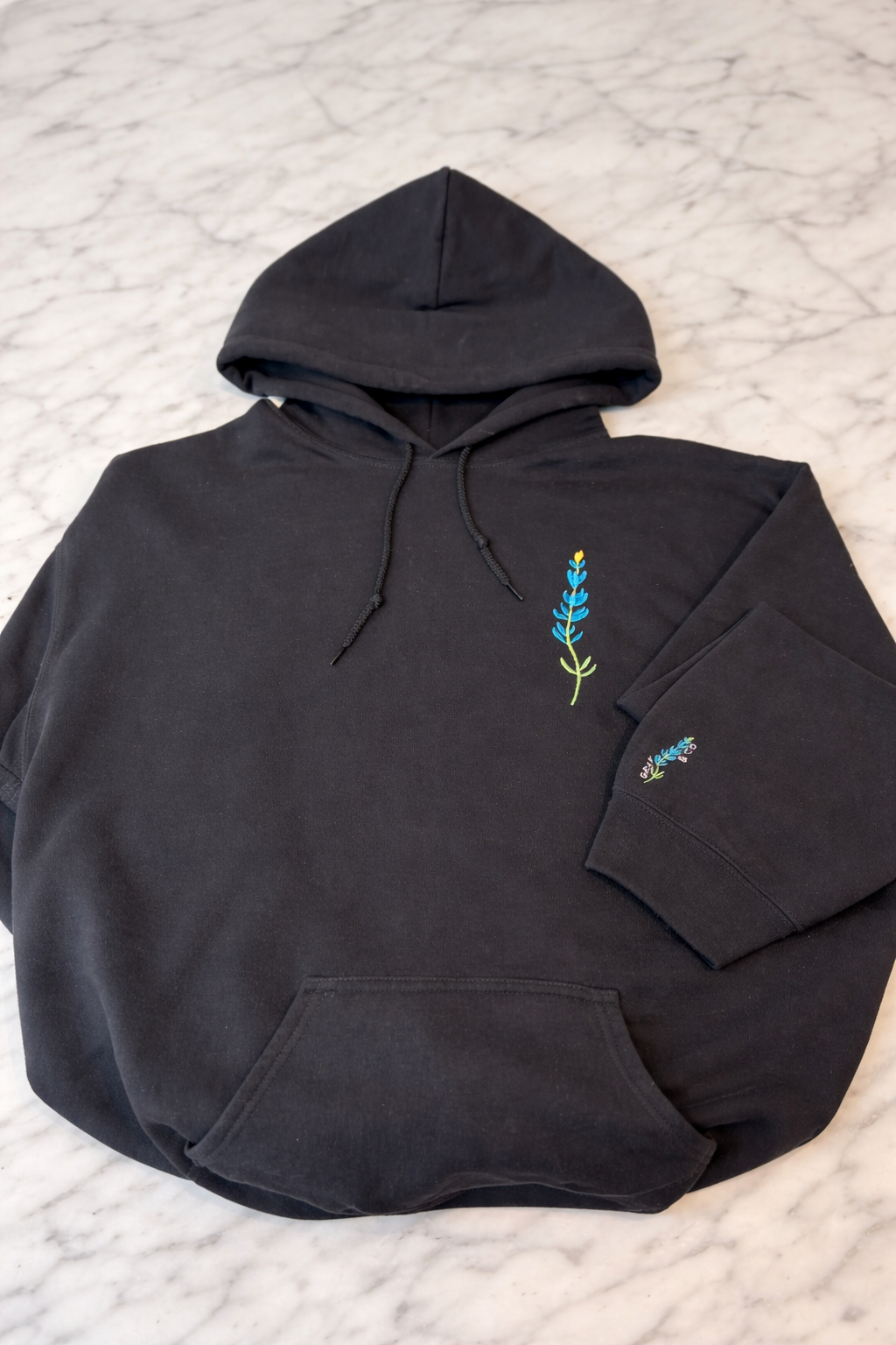 A warm, medium-weight 50/50 hoodie with an embroidered hand drawn bluebonnet and Gray&Co Logo. Designed for any occasion, a classic kangaroo pocket, and a double-lined hood—finished with a tag-free label and ethically sourced materials.